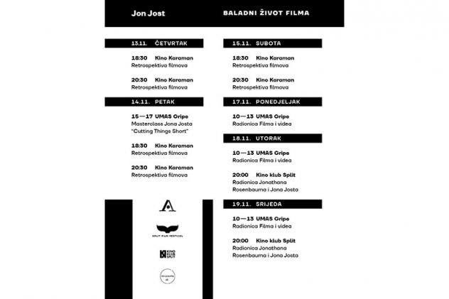 U Kinu Karaman od 13. do 15. studenoga prikazat će se izbor njegovih ključnih dugometražnih filmova – Slow Moves, Homecoming, All the Vermeers in New York, Rembrandt Laughing, Last Chants for Slow Dance i The Bed You Sleep In – uz razgovor s autorom. Program uključuje masterclass Jona Josta i njegovu radionicu digitalnog filma na Umjetničkoj akademiji u Splitu (UMAS) te radionicu Jonathana Rosenbauma o pisanju filmskih eseja uz analizu Jostovih filmova u Kino klubu Split.
