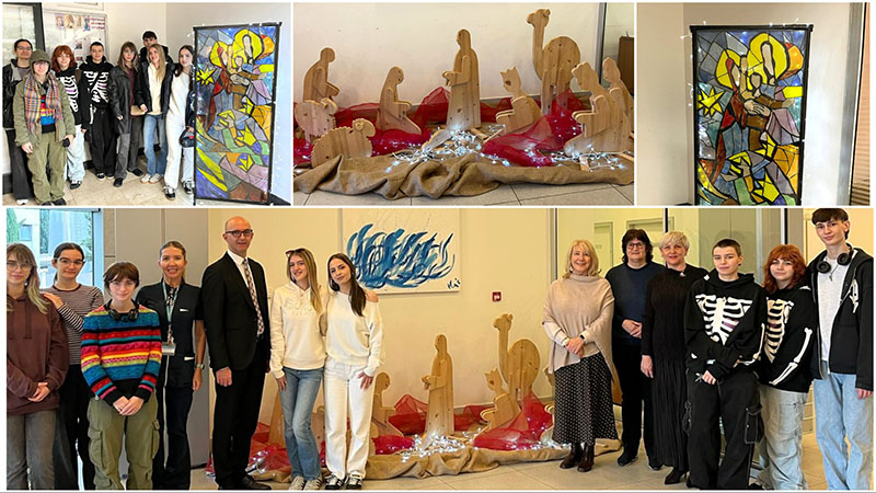 Škola je poklonila dvoje jaslice iz fundusa škole čiji učenici svake godine naprave nove jaslice u novoj tehnici. Jaslice su u bolničke prostore postavljali učenici trećeg razreda, smjer aranžersko-scenografske dizajneri, uz mentorstvo nastavnice Tanje Ukas. „Na Kliniku za ženske bolesti postavili smo jaslice izrađene od drveta, a na centralni ulaz u stacionar na Firulama jaslice izrađene od scenografskog vitraja. Riječ je o jednoj posebnoj tehnici lijepljenja bojanog stakla“.