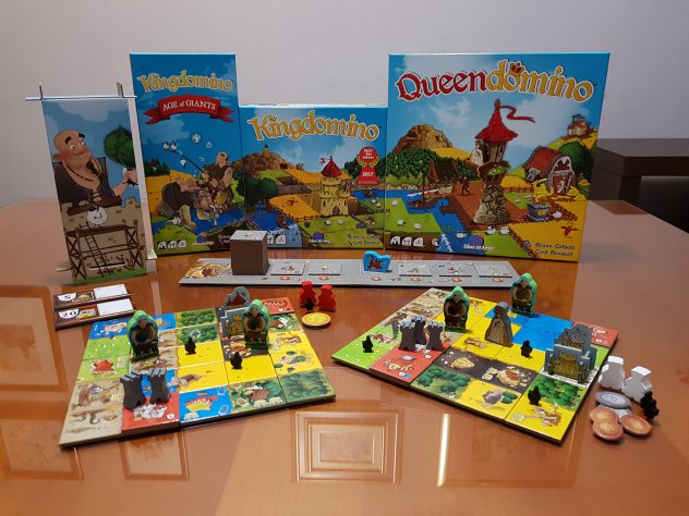 Najnoviji član Kingdomino obitelji je proširenje Age of giants koje se može pridodati objema igrama i tako na ploči oživiti još jednu vrstu mitoloških bića – divove. Iako se u ovom slučaju radi o dobronamjernoj sorti, to ne mijenja činjenicu da su veliki, nezgrapni i skloni uništavanju podloga na koje sjednu. Stoga se za svakog diva koji se brčka u “plićaku” ili pak šećući sudara sa stablima, vrijednost zemljišta smanjuje. Srećom, ovi divovi sami sebe smatraju velikim ljudima i time se ponose, pa kada se iz rukava izvuče ona svemoćna “Ljudi smo, dogovorit ćemo se”, u određenim ih se situacijama može nagovoriti da prošeću do susjednog kraljevstva i udomaće se u tamošnjem žitu.